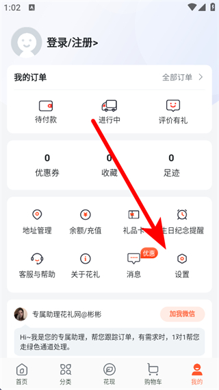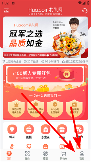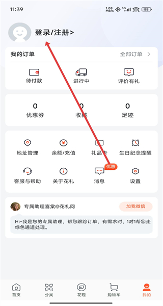 1、打开花礼网APP,点击右下角我的,进入个人页面。
