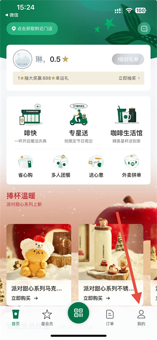 1、打开星巴克app,在首页找到底部我的选项并点击,进入个人页面。