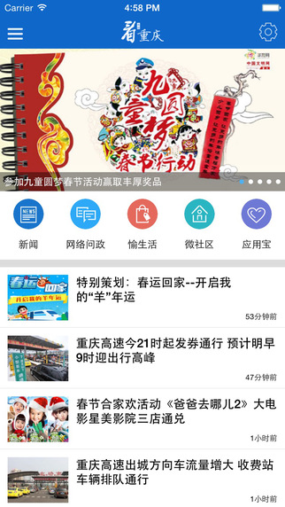 2、新闻,为你提供24小时滚动即时新闻,让你看重庆、知天下;你不仅能够阅读新闻,还能收听新闻、观看视频,还可以将你喜欢的内容分享到微博、微信等互动平台