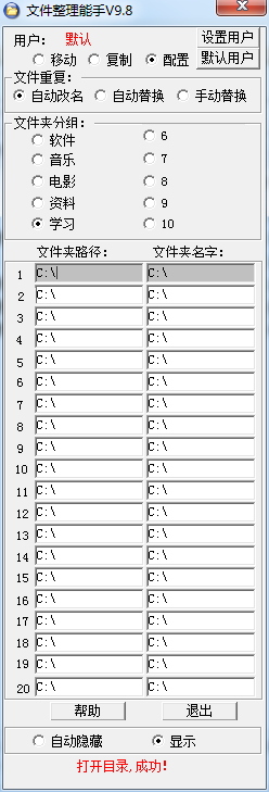 1.文件整理能手有十个文件夹路径设置功能,设置好文件复制路径后只要将需要整理的文件拖进对应的路径,文件就自动转移了,在整理大量不同类型的文件时很有效率。