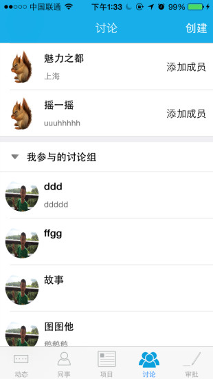 3. 讨论组:可自建或加入讨论组、可选择讨论组成员、可发表信息到讨论组(文字、图片)