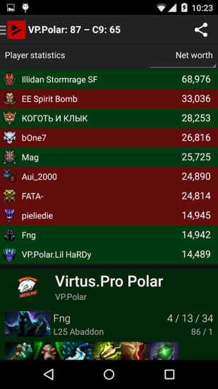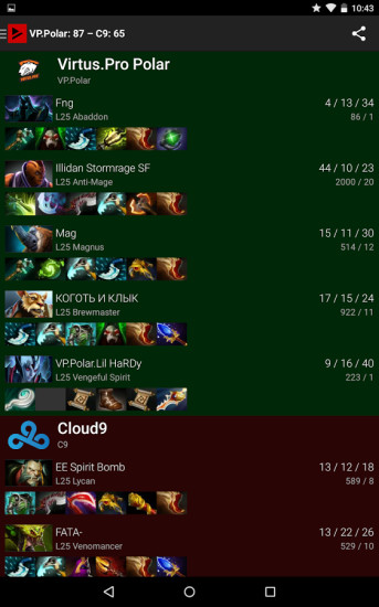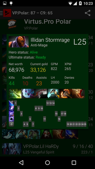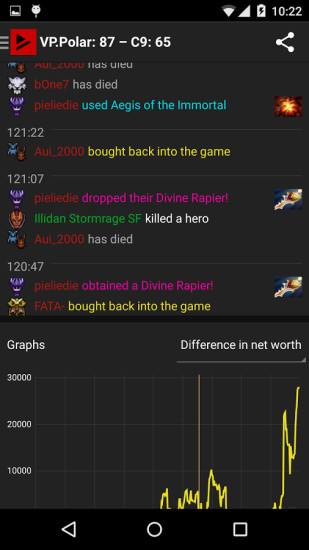 Follow live Dota 2 matches straight from your phone or tablet. Using our low-data application, you can keep track of nearly everything that goes on in a Dota 2 live game. Also available for desktop at www.trackdota.com! We're currently in Beta testing but check out the features we already have and what we have planned.Features:- Hero locations with tower and barracks status- Live score and series score- Action log - shows item purchases, buybacks, team fights and more- Live graphs - Net worth and XP- Player profiles - CS, Net worth, item build, skill builds, and much more- Sortable stats - know who is ahead instantlyComing soon:- Browse all matches- Tablet layout- Notifications for games when they startWe need the "View network connections" permission so we can tell whether you are connected to WIFI or mobile data to adjust data update frequencies. Dota ? is a registered trademark of Valve Corporation. This app is not affiliated with Valve.