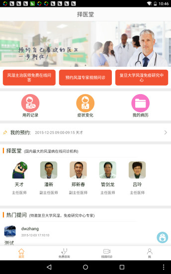 择医堂风湿专家是一套服务于广大想了解风湿日常保健知识的人、方便人们在家进行健康咨询的专业工具,集合了全国风湿病领域最有名的几十名教授和副教授,是一个关于风湿日常保健的远程视频咨询系统。