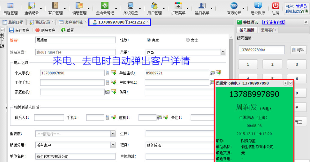 支持电话高清录音及电脑拨号,100G硬盘空间可以连续录10年。