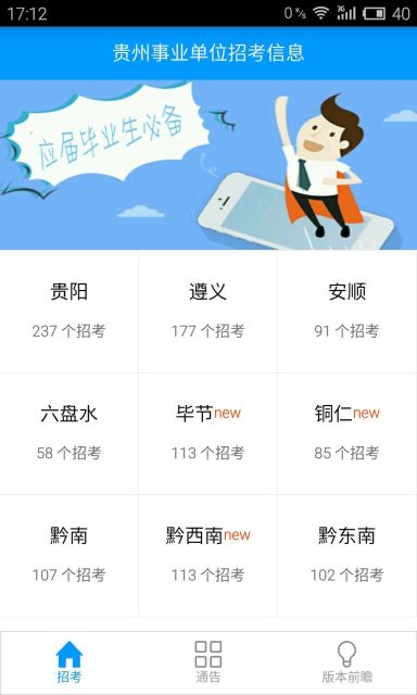 贵州招考app是一款提供各种事业单位的最新招聘考试信息的客户端,涵盖各个领域的招考信息,实时提供贵州省事业单位招考信息,涉及政府、医院、学校、银行等领域,信息准确丰富。是贵州市民公考好助手!