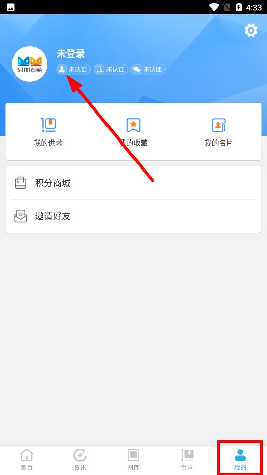 1、打开石猫石材app,进入界面后点击底部导航栏最右侧我的选项,在我的页面中点击未登录区域,即可进入登录注册相关操作界面。