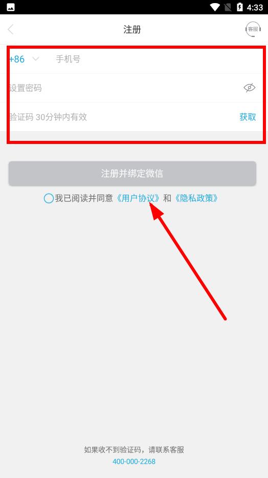 3、在注册页面,准确填写手机号和密码,点击获取验证码并填入收到的验证码,最后点击注册并绑定微信,即可完成石猫石材app的注册。
