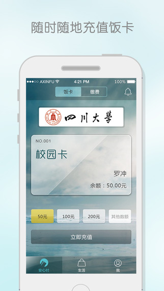 1.一卡通充值:( 200多家银行,免手续费 )通过手机APP或网页,10秒完成饭卡充值!支持国内大部分一卡通系统,支持一卡通在线挂失,消费记录查询。