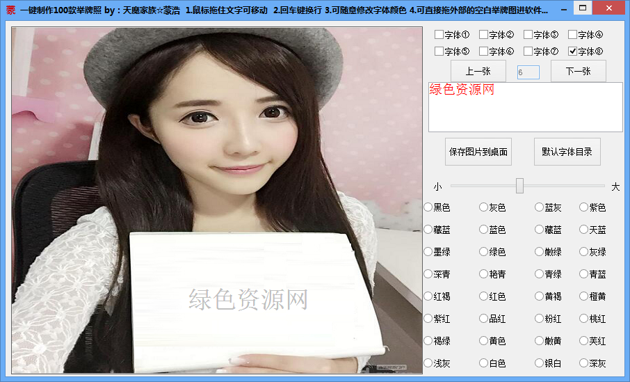 一键制作100款举牌照是一款制作举牌照的软件,微博上很多人都晒出了自己的举牌照,有些事自己的真实照片,然而大多数其实是使用软件做的,小编这里分享一个举牌照制作软件,可以一键制作出举牌照,支持多种颜色、多种字体、多种图片,超丰富内容制作,简单易用,欢迎下载!