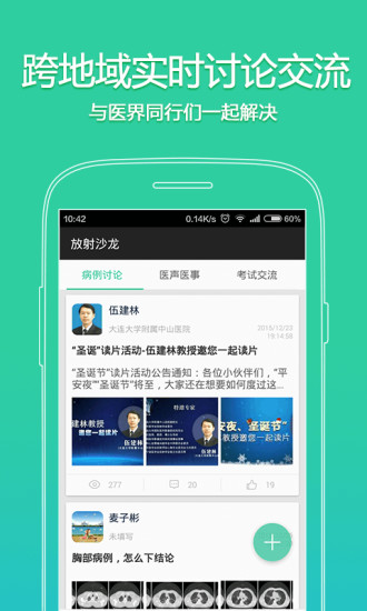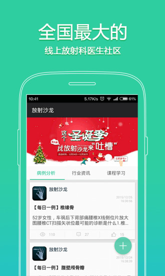 放射沙龙app是一款专注放射行业人士打造的学习交流平台,为每一位用户提供更优质的资讯信息,与权威医师在线交流,提升个人职业能力,欢迎在绿色资源网下载体验。