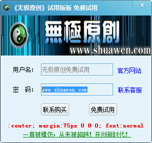 无极原创文章生成器是试用版,所以无需任何帐号密码就可以直接使用。演示版在打开软件的时候,会有提示框,请认真看一下提示框;只需要3步就可以看到效果;