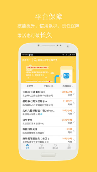 在微工,个人可以根据闲暇时间和地理位置来找到靠谱的零散活儿,并快速得到酬劳和积累工作经验。