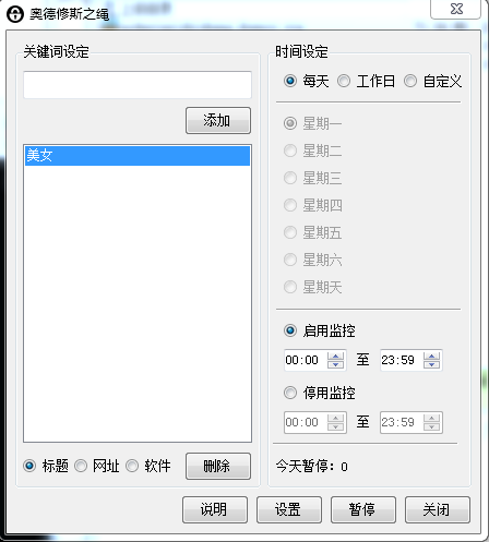 软件模式:您想屏蔽什么软件,就把那个软件的进程名(不是软件名哦)输入到“关键词设定”框,然后点击“添加”。今后只要您打开这个软件,它一般会被自动关闭,如果不能被自动关闭的话,OdysseusLine也会不断弹出提醒,直到您手动关闭它。