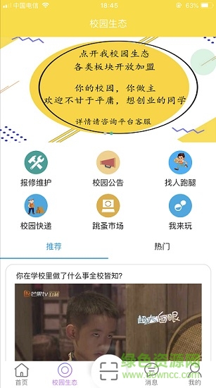 点开我,通过食堂外卖、网上超市、快递跑腿、报修维护、我来卖、我来玩、我有才等板块,建立校园生态圈,提供校园生活所需的各项服务。