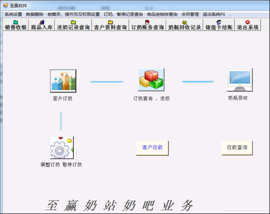 客户订奶管理,奶吧收银管理、会员管理、进销存管理。