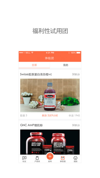 2.体验团:由用户通过积分免费申领体验产品。在app上线时,会有若干个产品体验的活动开放。