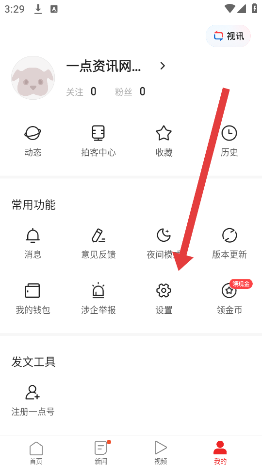 1、打开一点资讯APP,进入我的页面,点击设置的选项,进入个人账号设置的界面。