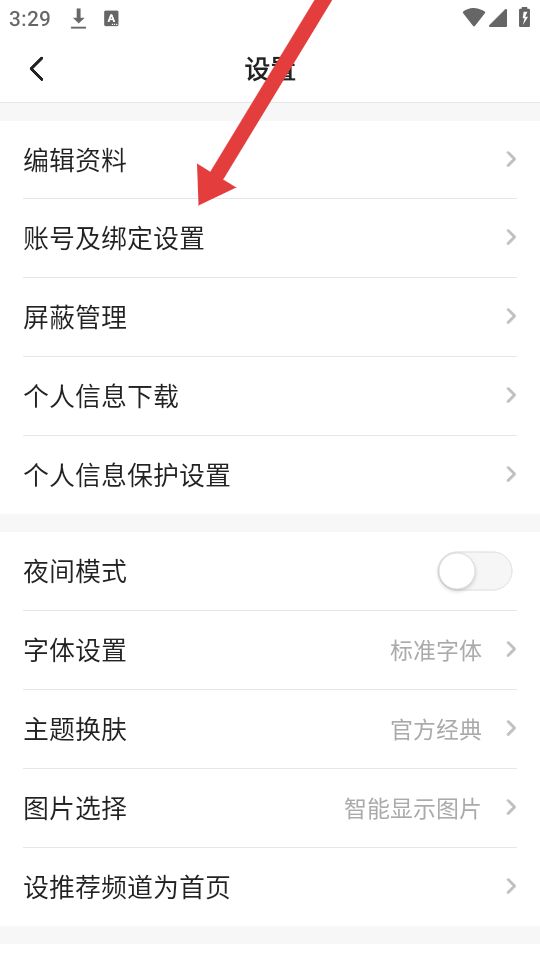 2、在设置的页面中,需要点击账号及绑定设置的选项,进入账号绑定管理的页面。