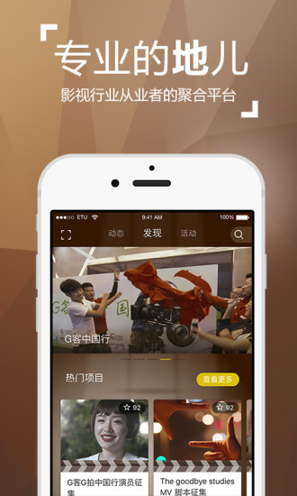 3.G客平台满足影视拍摄提供扶助原创、内容招募、工作人员招募等需求,从业者可在G客平台上随时随地参与互动活动,进行信息分享。
