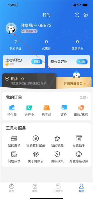 2、在个人中心页面点击健康账户区域,进入个人资料页面。