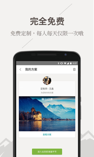旅行君的定制旅行理念,就是让你的旅行,只玩你想玩的。你设置旅行人数,选择蜜月、亲子、家庭、朋友出行或其他,为你设计的旅行方案就会符合你选择的旅行风格。旅游路线独一无二,为你专属量身定制。