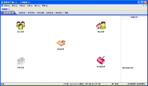 优图样品管理软件是一款通用的样品信息管理软件,主要功能包括样品管理、员工管理 、往来单位管理,同时还包括共享文档管理、知识库管理、内部消息、excel数据导入导出等功能。 该软件具有强大的可定制、可伸缩性,用户可以根据自己的企业需要做相关设置以满足自己的个性需求。软件以sql server 2000或SQL Server2005为后台数据库;对于业务数据量大、稳定性要求高、操作终端多的用户尤其适合。该软件支持对业务资料的模糊查询、组合查询、汉字首拼音字母查询;支持样品图片自定义显示方式;支持多级权限管理;支持条码管理;支持打印报表的自定义修改;数据自动备份功能;支持在线免费升级。