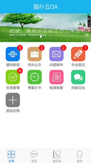 猫扑移动OA交互界面采用九宫格形式,充分展现了清新淡雅的画面、清晰的功能划分、方便的按键设置,操作起来更简单、便捷、实用。