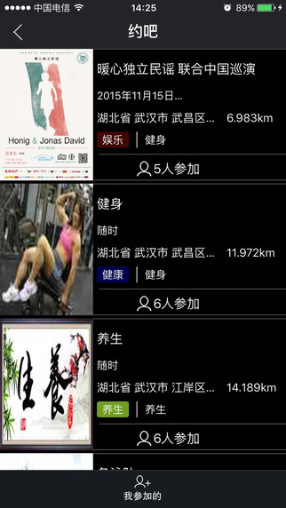 “武汉观”的“约吧”平台,为用户提供近郊游、歌友会、演唱会、体育健身、商业活动、讲座等好玩、有趣的活动信息