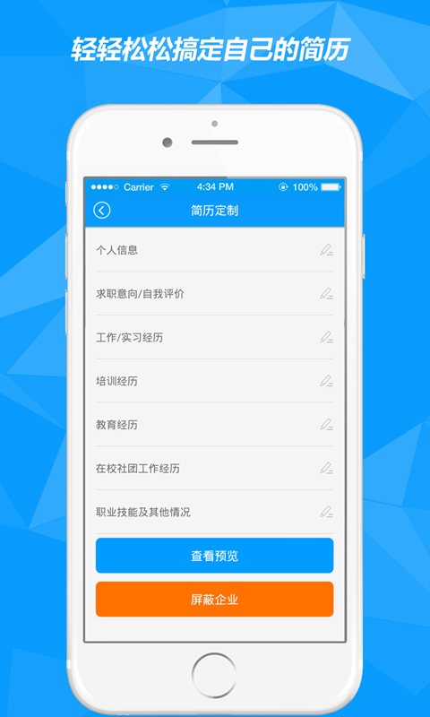 只需简单的信息填写,可以帮你快速的完成简历的定制