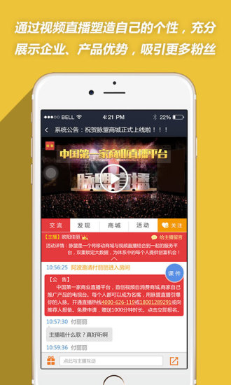 脉盟app是一款为商家展示自我的平台,也是最有趣、好玩的直播平台,在这里你可以通过直播来向客户展现自己的商品和企业,提高自己的知名度,也可以选择在这里直接购买到各类商品