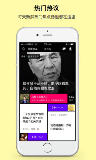OPEN开腔app是一款全新的资讯平台,在这里你额可以查看到时下最有热议的话题,并且应用也会邀请各类知名的主持人供您进行交流,这里是您最佳的聊天选择,赶快来下载体验吧。