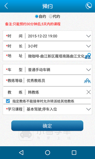 使用者安装“小马学车”手机APP,通过手机就可查找到陪练服务信息,系统将陪练服务进行分类,方便使用者检索和挑选,并可在手机预订培训服务教练和车辆。系统具有充值功能,培训服务完成后可自动扣费,陪练服务的事前订制和事后评价只需在手机端完成。