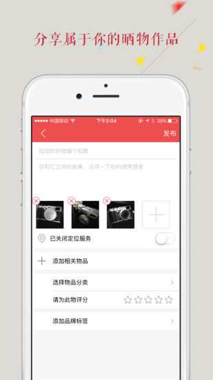 2.尽兴分享自己的好物:你我都有一颗对新鲜事物保持狂热追求的内心,而自己所得到的,更多也想分享给我们的志同道合,分享流程简单直接最好…晒物的极简设计则满足你分享时的快感体验!