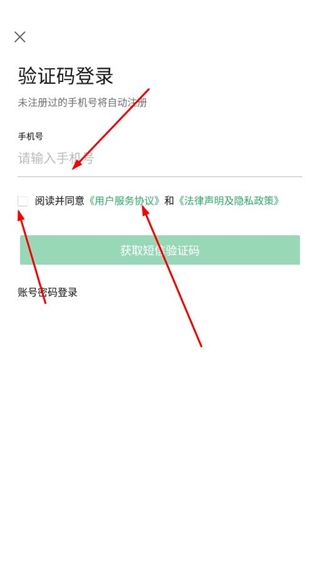 2、在验证码登录页面输入手机号,勾选协议后,点击获取短信验证码。