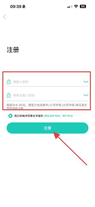 3、设置登录密码并再次确认密码,勾选同意相关协议后点击注册按钮。