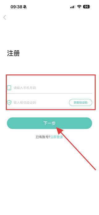 2、进入注册页面后,输入手机号码并获取验证码,填写验证码后点击下一步按钮。