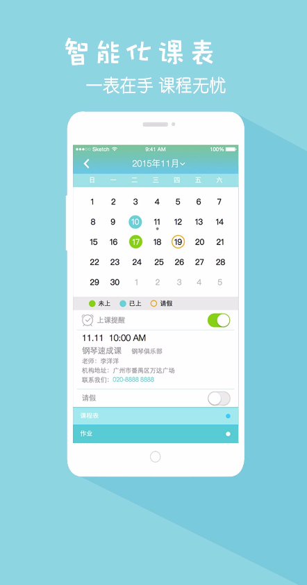 1.上课啦:智能课表神同步,再也不用错过上课时间,提醒、签到、请假、课后作业四个温馨功能,让你的孩子好上课,上好课。