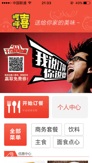 喜呵呵是一款在线订餐的app。主要消费群体是企业白领,以及在校大学生等。这款APP是基于线下的实体店面以及厂家的餐车而定制开发的。也就是现在流行的O2O模式。