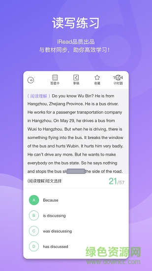 多读是一款适用于中小学生的英语在线学习app,同步课本教材移动学习,口语听力练习做题训练模拟考试有效提高英语能力。快来绿色资源网下载体验吧!