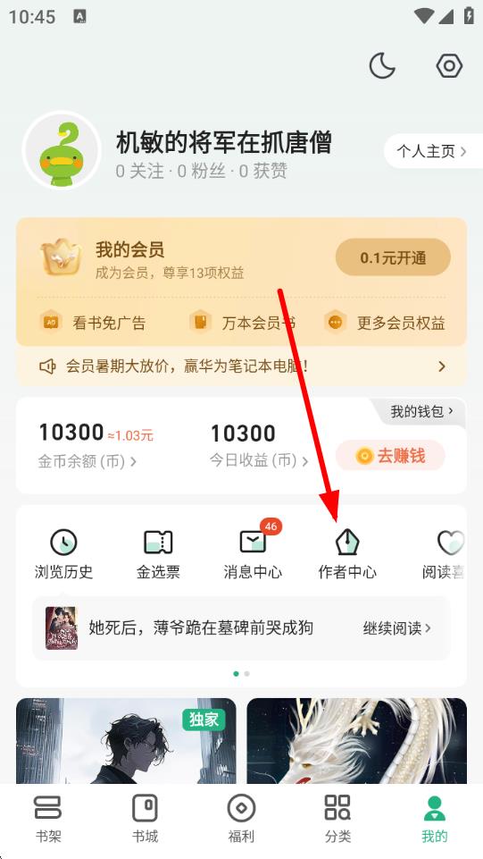 2、在个人中心界面中,找到作者中心选项并点击进入,在作者中心里,你可以了解到一些关于创作的福利、征文活动等信息。