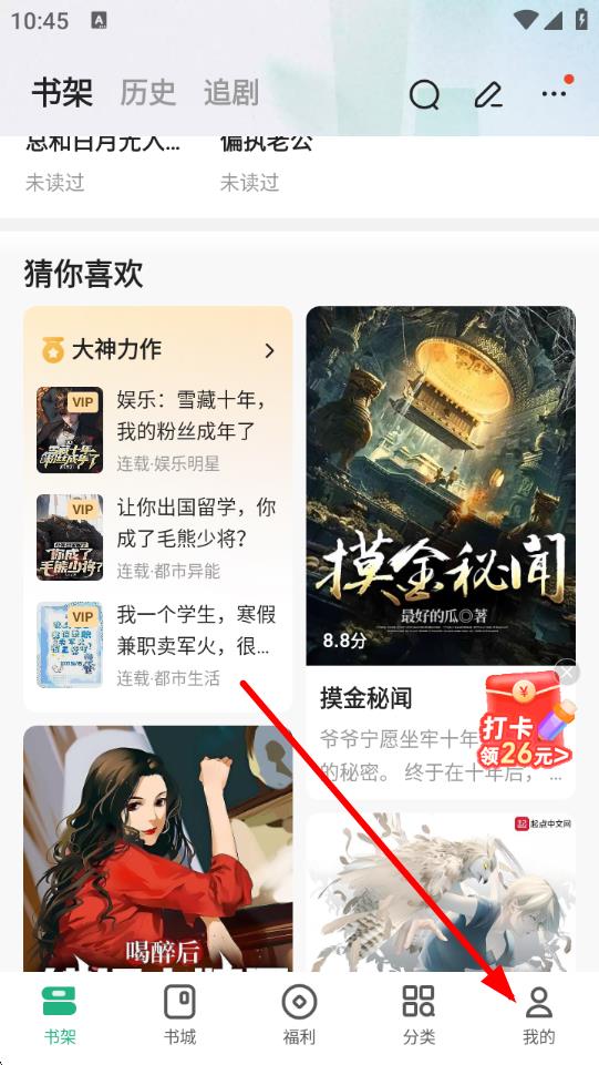 1、打开书旗小说APP,点击底部导航栏中的我的,进入个人中心界面,这里能看到多项个人相关功能选项。