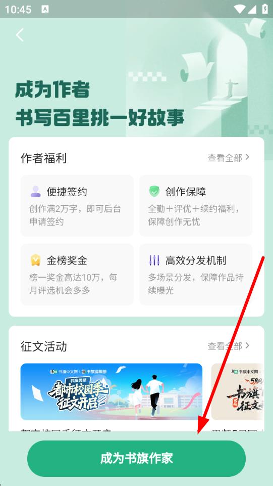 3、在作者中心页面下方,点击成为书旗作家按钮, 按照后续的提示完成注册、实名认证等一系列操作后,就可以开始在书旗小说平台上进行小说创作啦。
