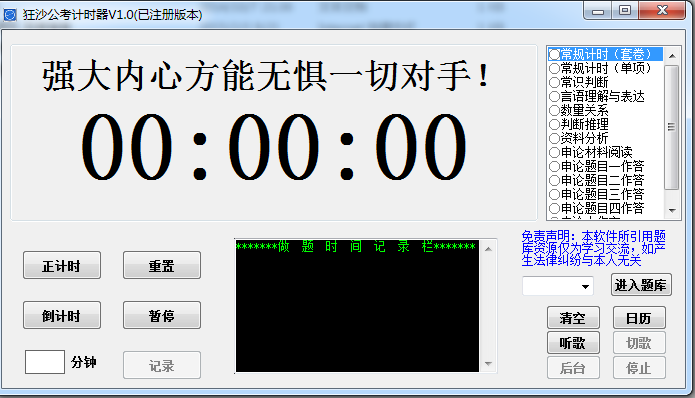 狂沙计时器是一款专门为用户打造的公考倒计时软件和在线考试软件,为用户提供计时功能、还可以正倒计时、记录功能等,方便快捷,有需要者欢迎下载!