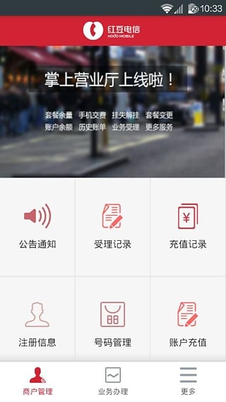 3.掌上营业厅:基于手机端的红豆电信服务平台,覆盖Android、iOS等操作系统,向红豆电信用户提供快速便捷的选号、查询、办理、交费等自 助式服务的客户端软件,可提供7*24小时全天候自助服务。