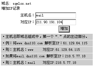 添加MX记录可以和域名提供商联系,让他为你代劳。比如单位的域名是sqmlzx.net,是www.dns110.com提供的,并由自己通过Web页面手动管理的。各个域名提供商的管理界面都是大同小异的。在此介绍一下设置经过,供读者参考。