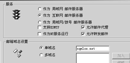 安装好软件后运行CMailServer,单击"工具--服务器设置",选中"作为互联网邮件服务器",在邮箱域名设置中,选择"单域名",填入上一步已设好邮件交换记录的域名"sqmlzx.net",如图4。