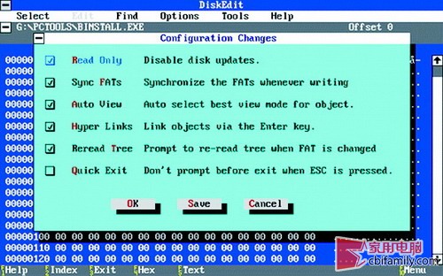 由于对磁盘的修改是必须生效的,所以首先要去掉软件的只读模式,按Alt并选择菜单Options(选项)中的Configuration(配置)。