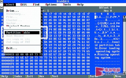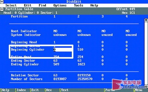 这里需要修改的只是分区1所对应的Beginning Cylinder(起始柱面),将光标移动到第一分区的Beginning Cylinder上,按数字键1将原来的0变改变为1,当然如果1磁道也坏了,那么你可以在这里键入2甚至3。