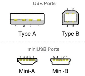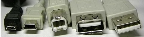 图中从左往右依次是:MiniUSB公口(A型插头)、MiniUSB公口(B型插头)、USB公口(B型插头)、USB母口(A型插座)、USB公口(A型插头)