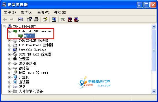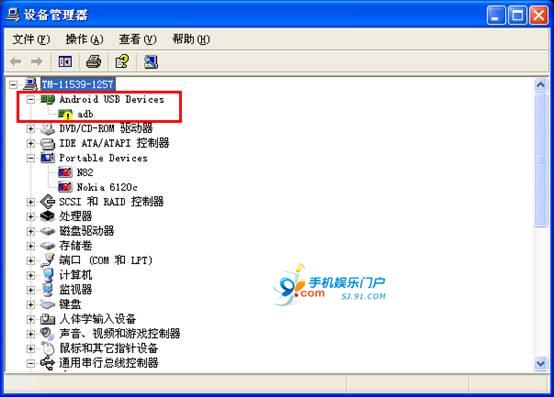 驱动安装完毕后,就可以看到"设备管理器"中Android USB设备的黄色感叹号已经去掉。